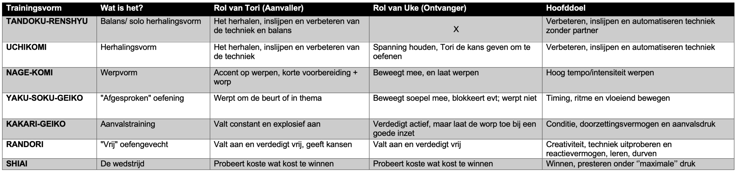 - Lichte Randori (Sutemi-geiko): Focus op souplesse. Je mag niet blokkeren met stijve armen. Als je wordt uit de balans gebracht, laat je je werpen en maak je een mooie val. Zo leer je vloeiend bewegen.